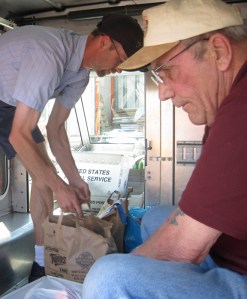 Branch 28 retiree Frank Garhofer (right) helps letter carrier Rich Franklin unload a mail truck filled with donated food.