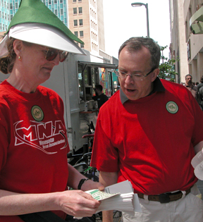 MNA staff representative Linda Lange and registered nurse Bob Michaelson hand out water and fliers downtown Minneapolis.