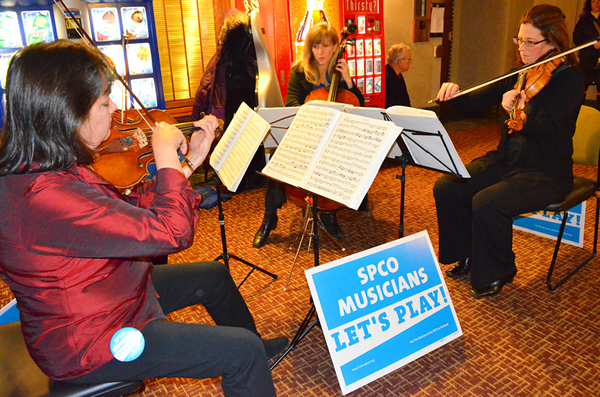 Musicians locked out by the St. Paul Chamber Orchestra perform an impromptu concert in the hall outside a Minnesota House committee hearing on lockouts.