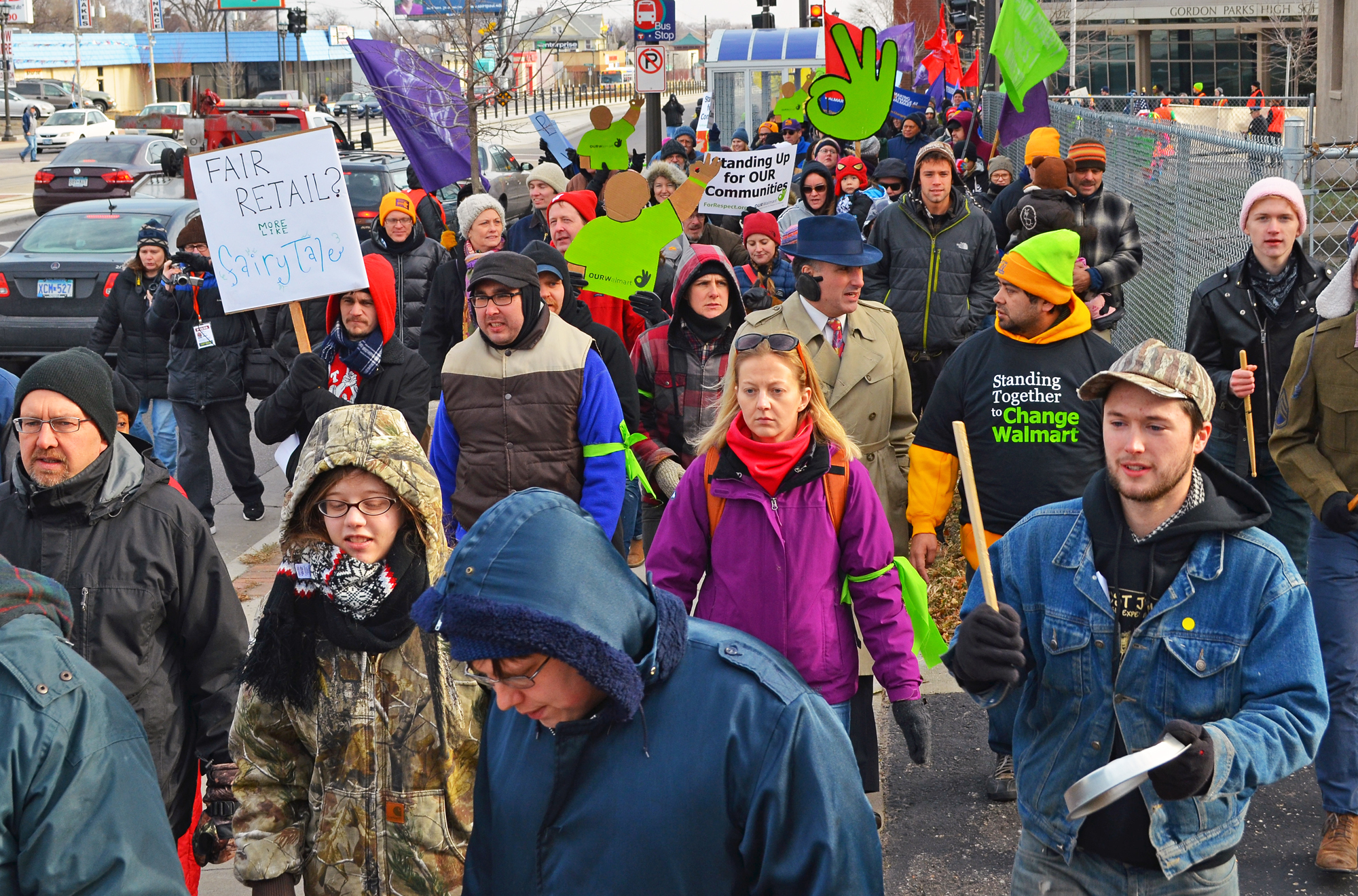 Carrying a banner that read “End Poverty Wages in Minnesota,” demonstrators march past the Midway Walmart’s entrance in St. Paul on Black Friday.