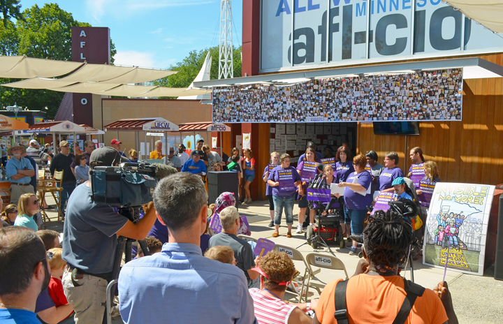 Pro-union home health care workers and their clients celebrate the results of their organizing election at the Minnesota AFL-CIO Labor Pavilion on the State Fairgrounds.
