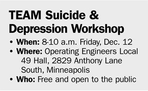 The timing is right, then, for the workshop TEAM will host Dec. 12 on mental health, clinical depression and suicide at the Operating Engineers Local 49 Hall in St. Anthony. The program is free, open to the public and includes breakfast. (Call 651-642-0182 for details or to RSVP.)