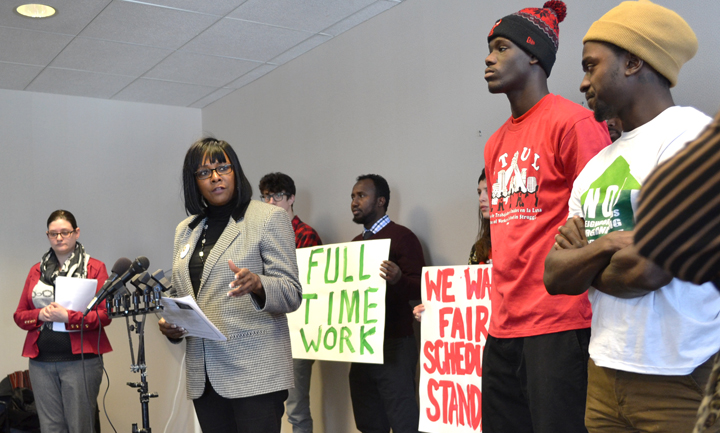 CTUL member Bobby Brown said his hours at a McDonald’s in Bloomington have dried up to the point where his last paycheck was $14. Ronda Jama, a wheelchair agent at Minneapolis-St. Paul International Airport, used to work four days per week; now she works two – and waits “on call” in case AirServ, her employer, makes more hours available.