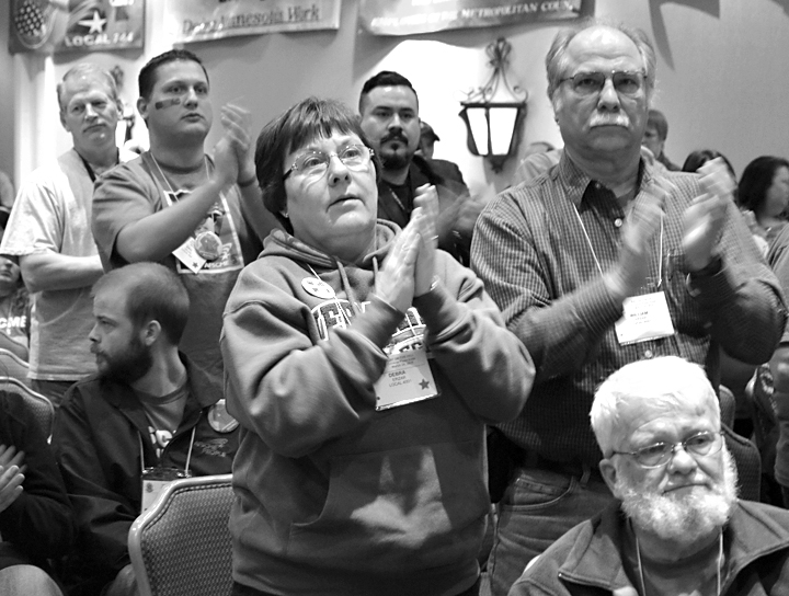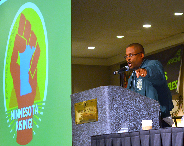 AFSCME Local 8 President Angela Marlow, a child support agent, told members she used to work in Wisconsin; now she works for Ramsey County.