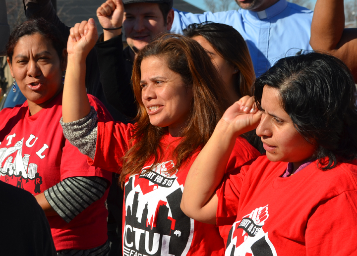 The worker center CTUL, which supports organizing in the fast-food industry locally, staged the press conference to announce the April 15 strike date. As cars sped past on Hiawatha Avenue, representatives of student groups, unions and the faith community pledged to stand in solidarity with the striking workers.