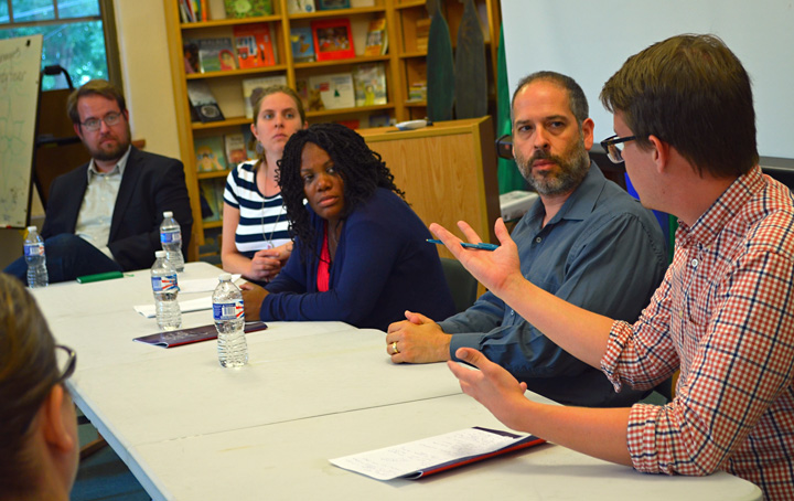 Panelists at the East Side Freedom Library yesterday included (L to R) Michael Diedrich, Caitlin Reid, Zuki Ellis, Steve Marchese. SPFT political organizer Patrick Burke moderated.
