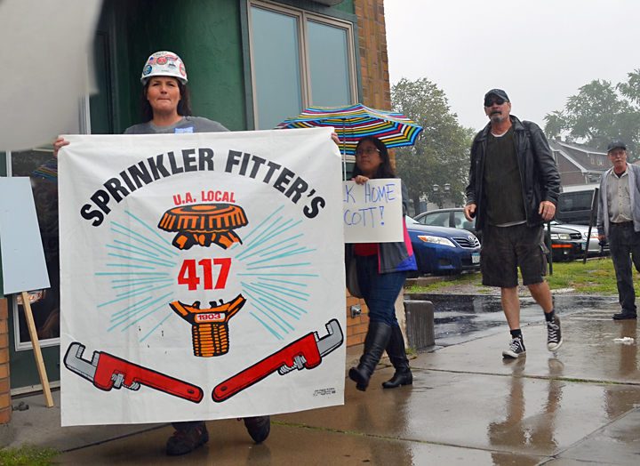 Kimberly Brinkman carriers Sprinklerfitters Local 417’s banner outside a Scott Walker appearance in St. Paul.