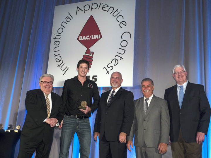 After finishing their work, Peterson and other apprentices had to wait to find out who won until the BAC’s banquet later that night. A celebration of the union’s 150th anniversary, the event drew more than 1,000 people, who watched as BAC international officers, including President James Boland, called Peterson up to the stage to accept his award.
