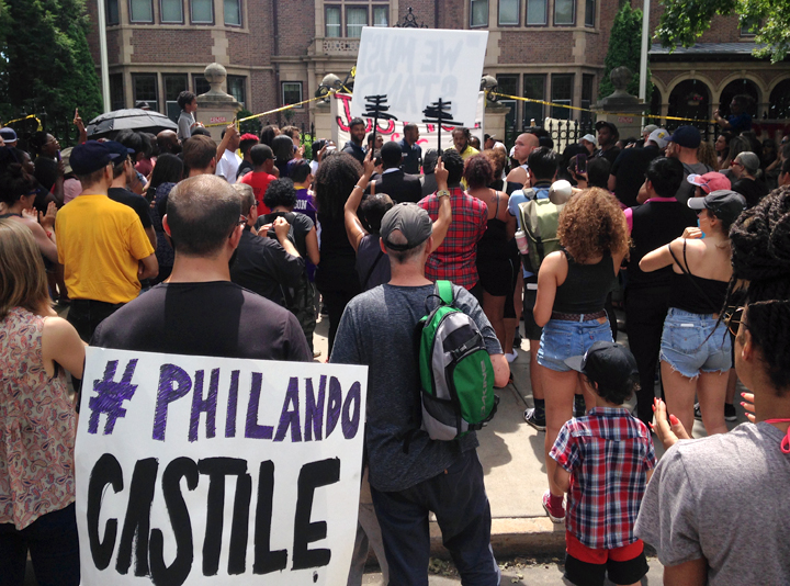 Demonstrators gathered outside the Governor’s Residence in St. Paul today to call for justice in the shooting of Phil Castile.