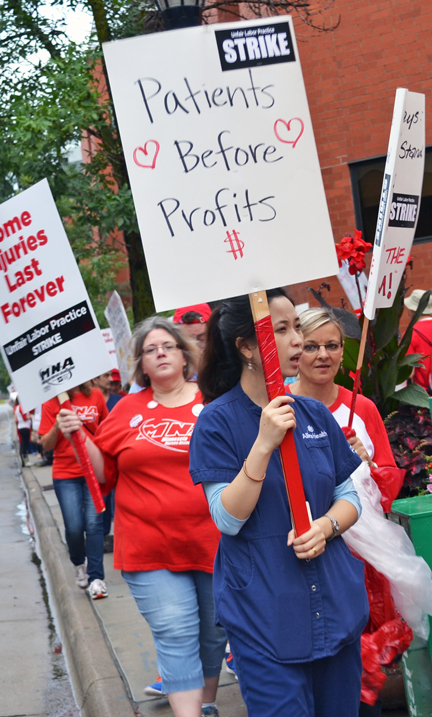 For the second time this summer, union nurses at United, Abbott Northwestern, Mercy and Unity hospitals and Phillips Eye Institute walked off the job and onto the picket lines, this time in an open-ended strike. Allina nurses staged a seven-day strike at the same facilities in June.