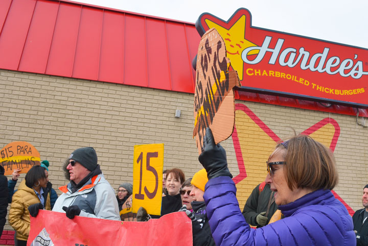 Opponents of Andy Puzder’s nomination to lead the labor department rallied last Thursday outside Hardee’s in St. Paul.