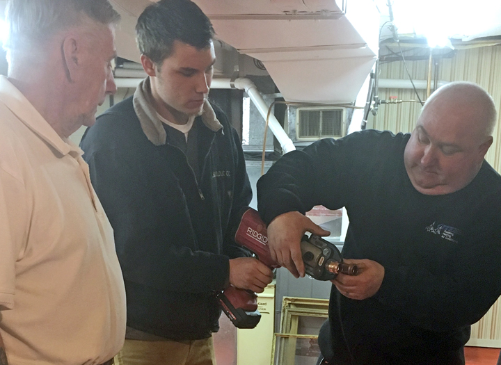Plumbers Local 34 members and apprentices provide repairs to an elderly Roseville homeowner during Water’s Off. From L to R: retiree Al Aschenbrener, apprentice Jason Chrysler and journeyman Jim Schumann. Said Aschenbrener, “As long as I’m still moving, I will be here to help out.”