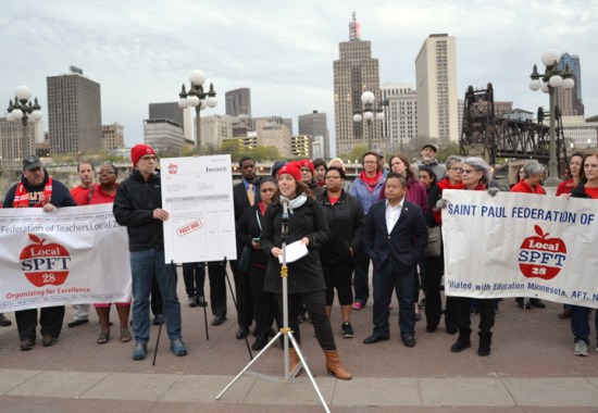 Anticipating negotiations with a school district that seems perpetually short on resources, St. Paul teachers launched their contract campaign today – Tax Day – by calling on the city’s wealthiest corporations to pay their fair share toward local public schools.