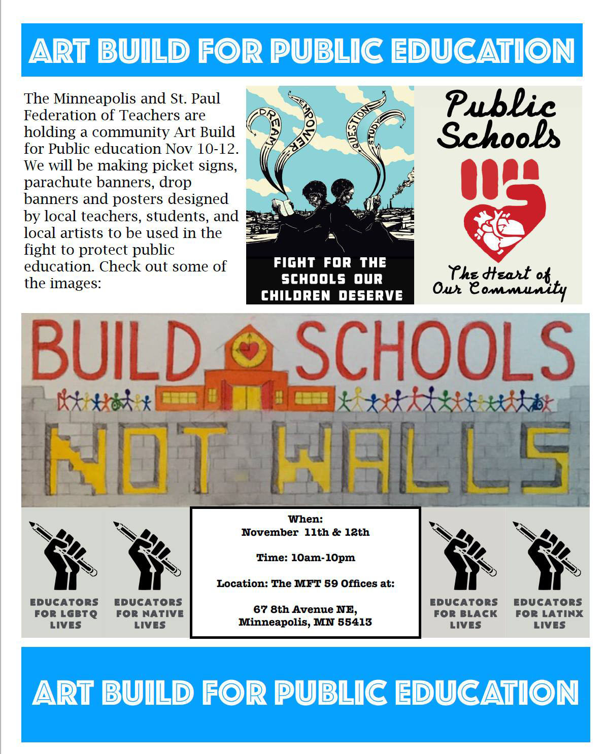 The public is welcome to participate in the art build, which will take place Friday afternoon through Sunday at the Minneapolis Federation of Teachers’ offices, 67 Eighth Ave. NE, Minneapolis. (View the event page on Facebook to learn more or sign up for a shift.)