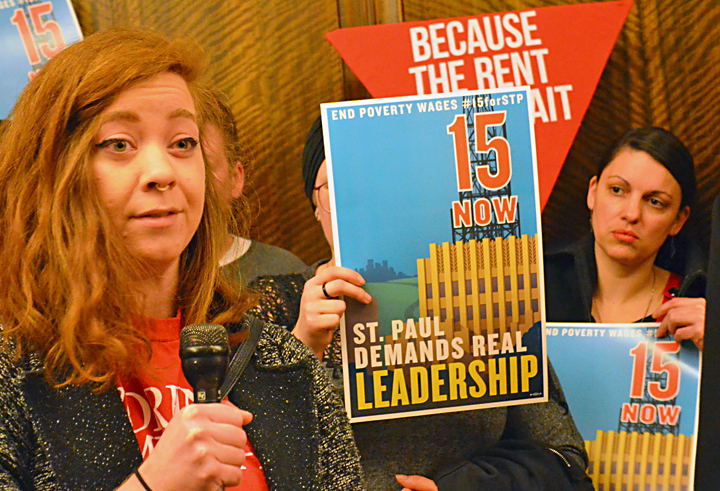 Low-wage workers listened as the author of a report on raising St. Paul’s minimum wage summarized her findings at yesterday’s City Council meeting. Then they put council members on notice.