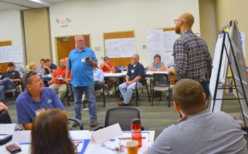 Todd Dahlstrom (blue shirt), the Minnesota AFL-CIO’s organizing director, leads a session during the AFL-CIO Organizing Institute last week in St. Paul. The Minnesota Nurses Association hosted the three-day training.