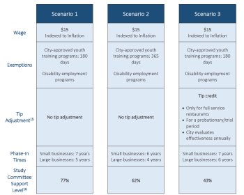 While the study committee’s three scenarios all embrace $15, they do provide exemptions for city-approved youth training programs and employers who hire workers with disabilities. The scenarios also differ in how long employers would have to phase in the full $15 minimum wage (between four and seven years, depending on the size of the employer).
