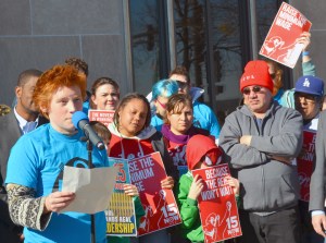 Erin Lynch, a server at a full-service restaurant in St. Paul, speaks at a press conference staged by supporters of a $15 minimum wage with no tip adjustment.