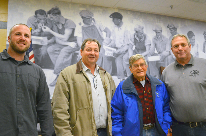 Frank Sramek pauses for a photo with Local 512 Business Manager Barry Davies (R) and Duluth-area reps Keith Musolf and Darrell Godbout.