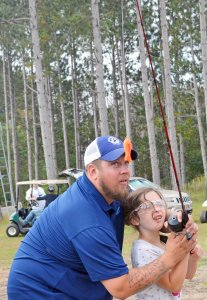Eric Bakken, an event coordinator with the Union Sportsmen’s Alliance and native of Blaine, taught 9-year-old Elsie Franklin of Oak Grove how to cast a fishing line.
