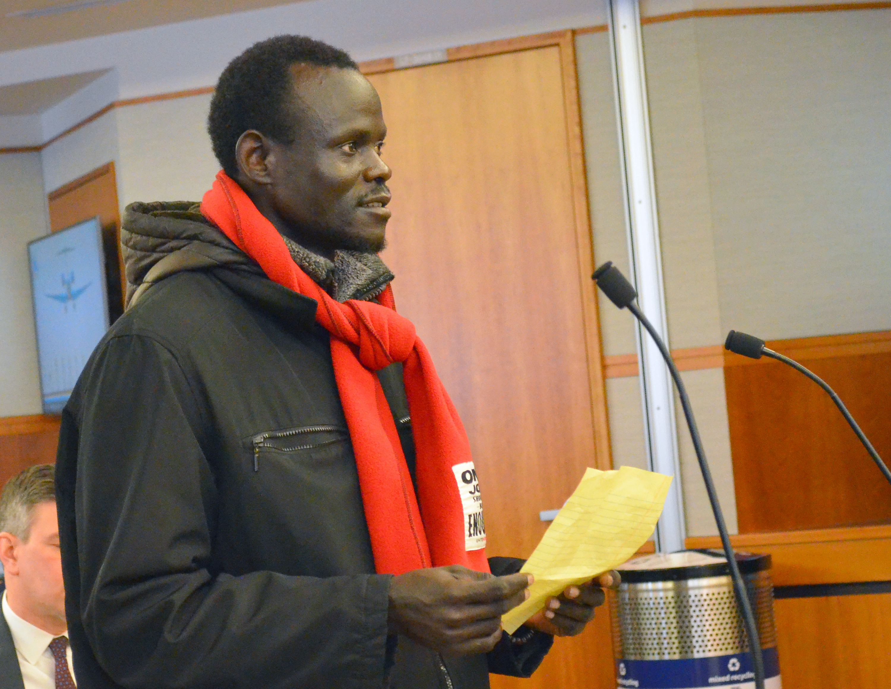 Ahmed Abdul Aziz, a member of Teamsters Local 120 who works for a rental-car agency, speaks before the Metropolitan Airports Commission in favor of a $15 minimum wage.