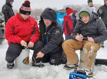 Volunteer Mike Rodger (center) of Cement Masons Local 633 shared ice fishing tactics with a pair of young participants. (submitted photo)