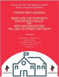 Before the vote takes place, SPFE will hold an information session for parents to discuss what its bargaining proposals are – and why educators are willing to strike for them. The session will begin at 10 a.m. Saturday, Feb. 15, at the union’s headquarters, located at 23 Empire Dr., St. Paul.