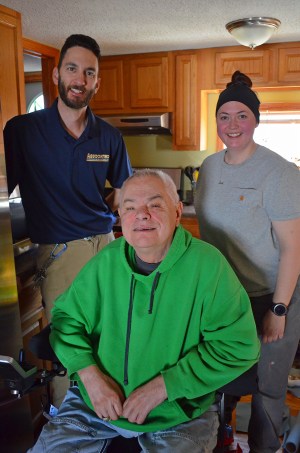 Brett Bernhjelm and Julia Kunze pause for a photo with Dave Hallis, a disabled Navy veteran whose Maplewood home needed plumbing repairs. Bernhjelm is a military veteran, too, having served six years in the Minnesota National Guard.