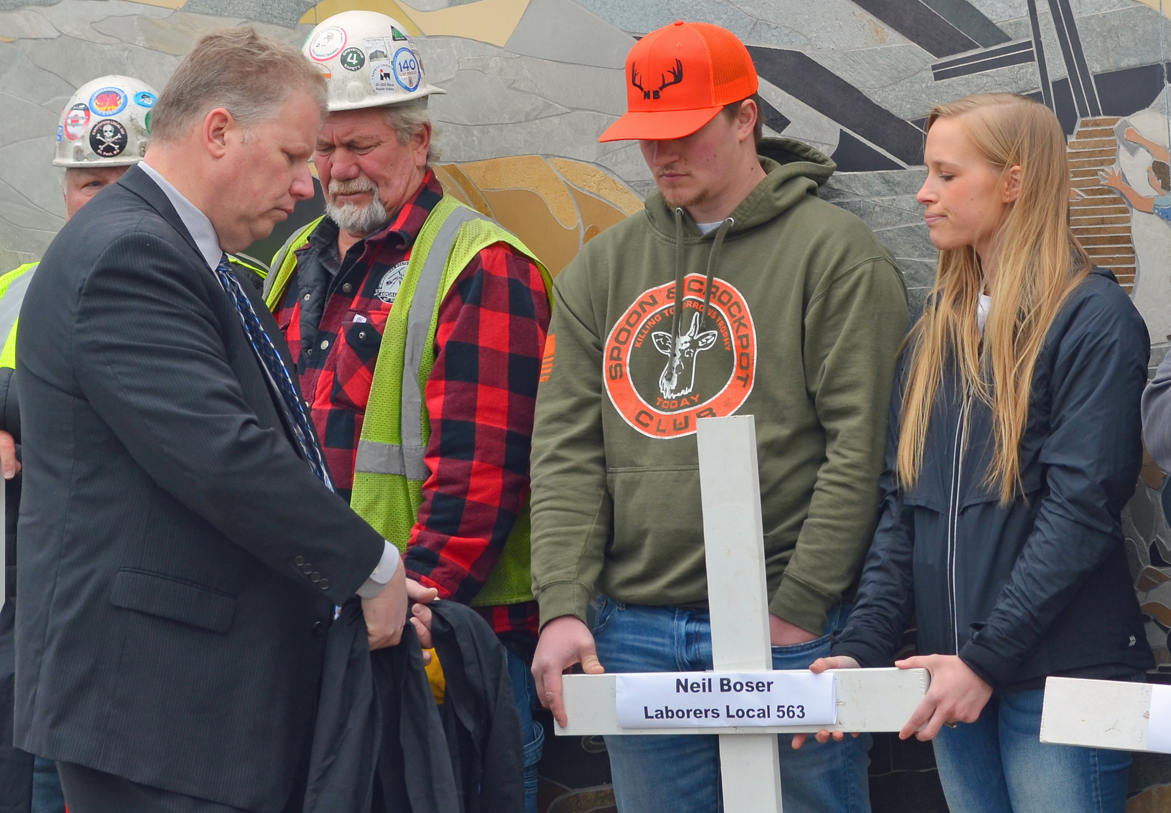 Standing along a stone memorial wall, union leaders and family members held 12 white crosses with the names of fallen union members: Neil Boser of Laborers Local 563; Gerald Peterson, Eric Raddatz, Dean Sinwell and Robert Vogelsberg of Operating Engineers Local 49; Duane Peterson, Craig Hansen, Robert Winczewski and Eric Dennis of Glaziers and Glassworkers Local 1324; George Kisel and Gary Newman of Heat and Frost Insulators Local 34; and Donald Hopper of Painters Local 1962.