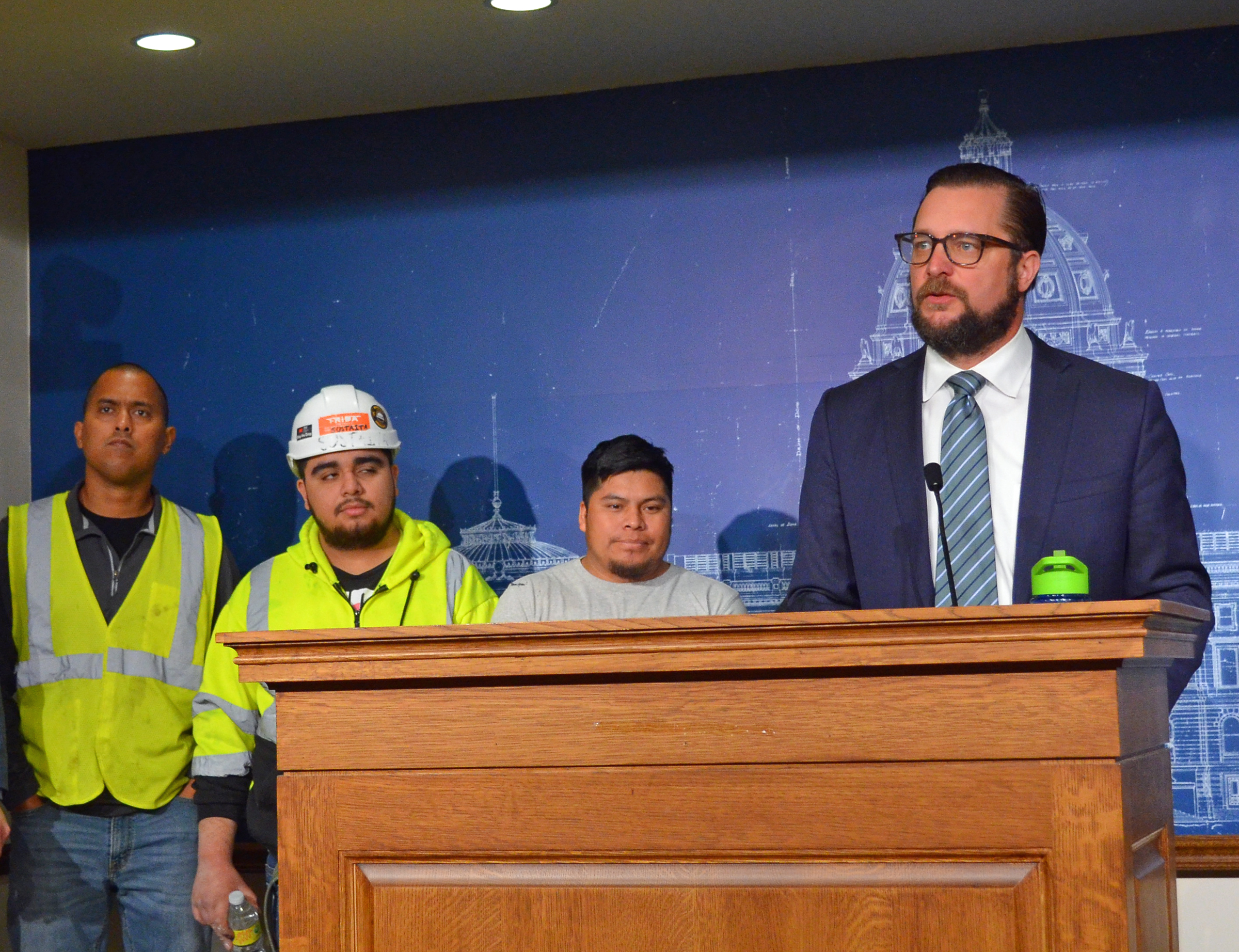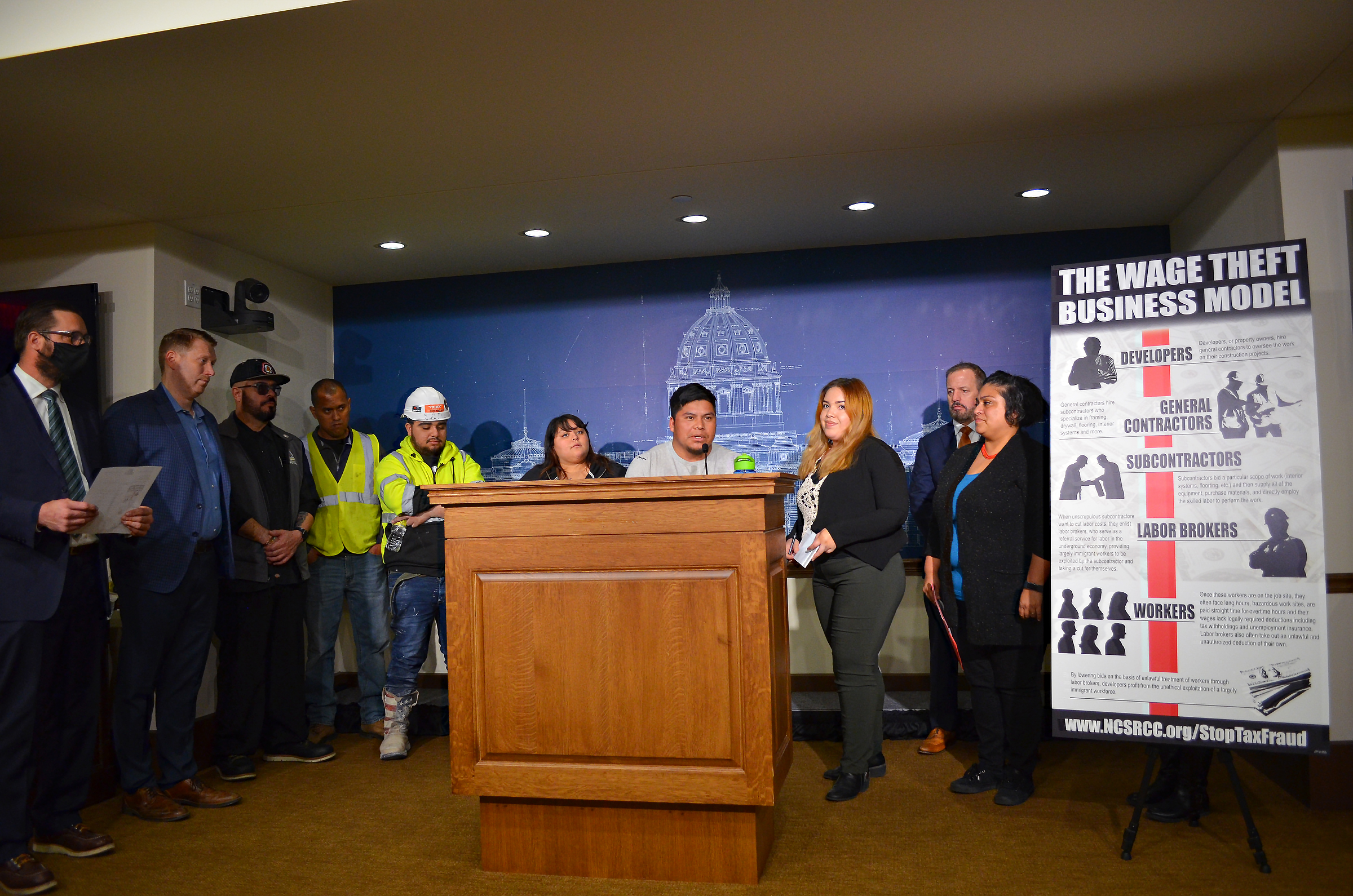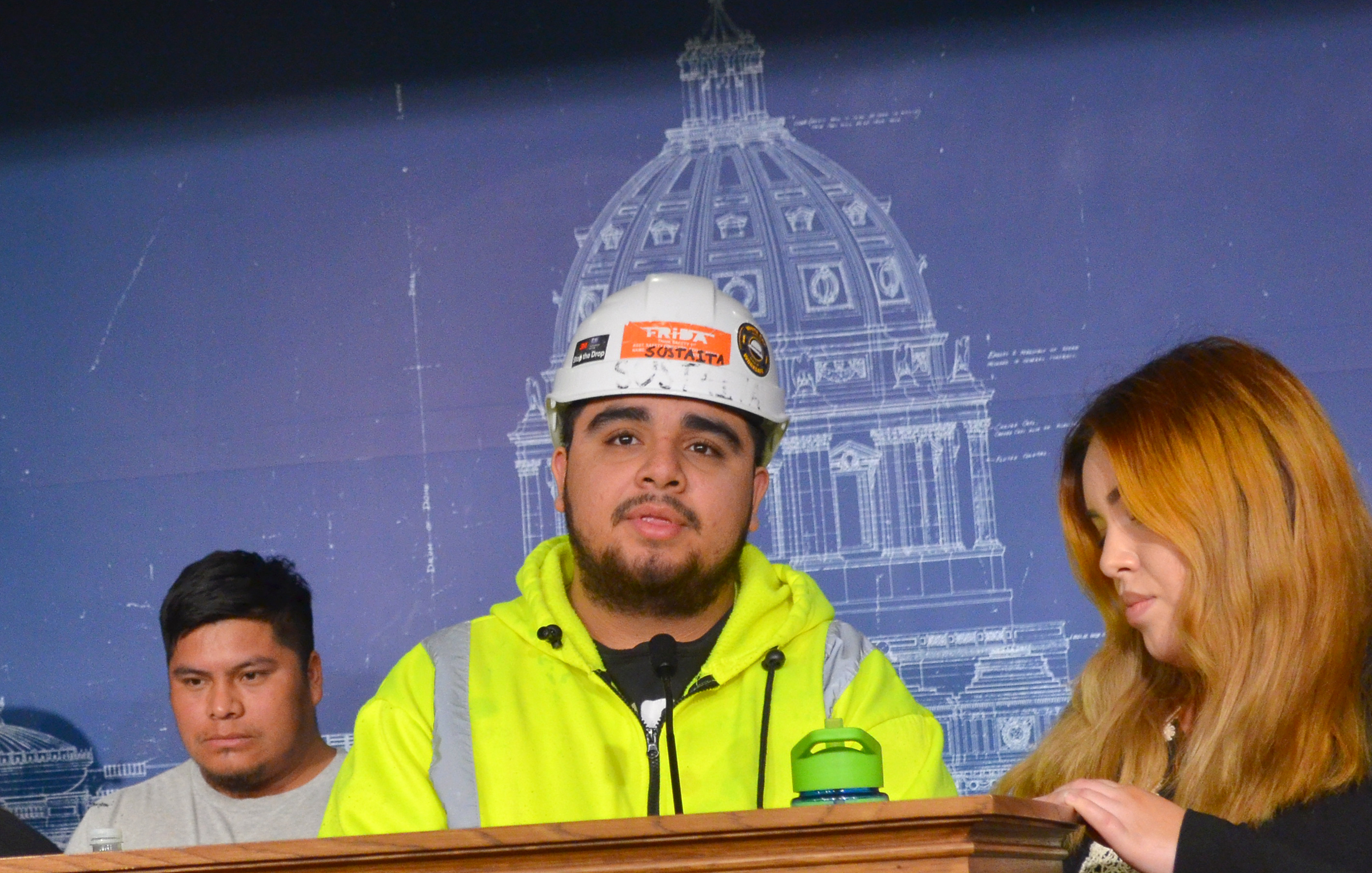 Abel Susteito speaks at a Capitol press conference about his experience with wage theft on the Viking Lakes apartment project in Eagan.