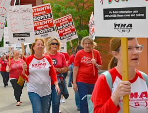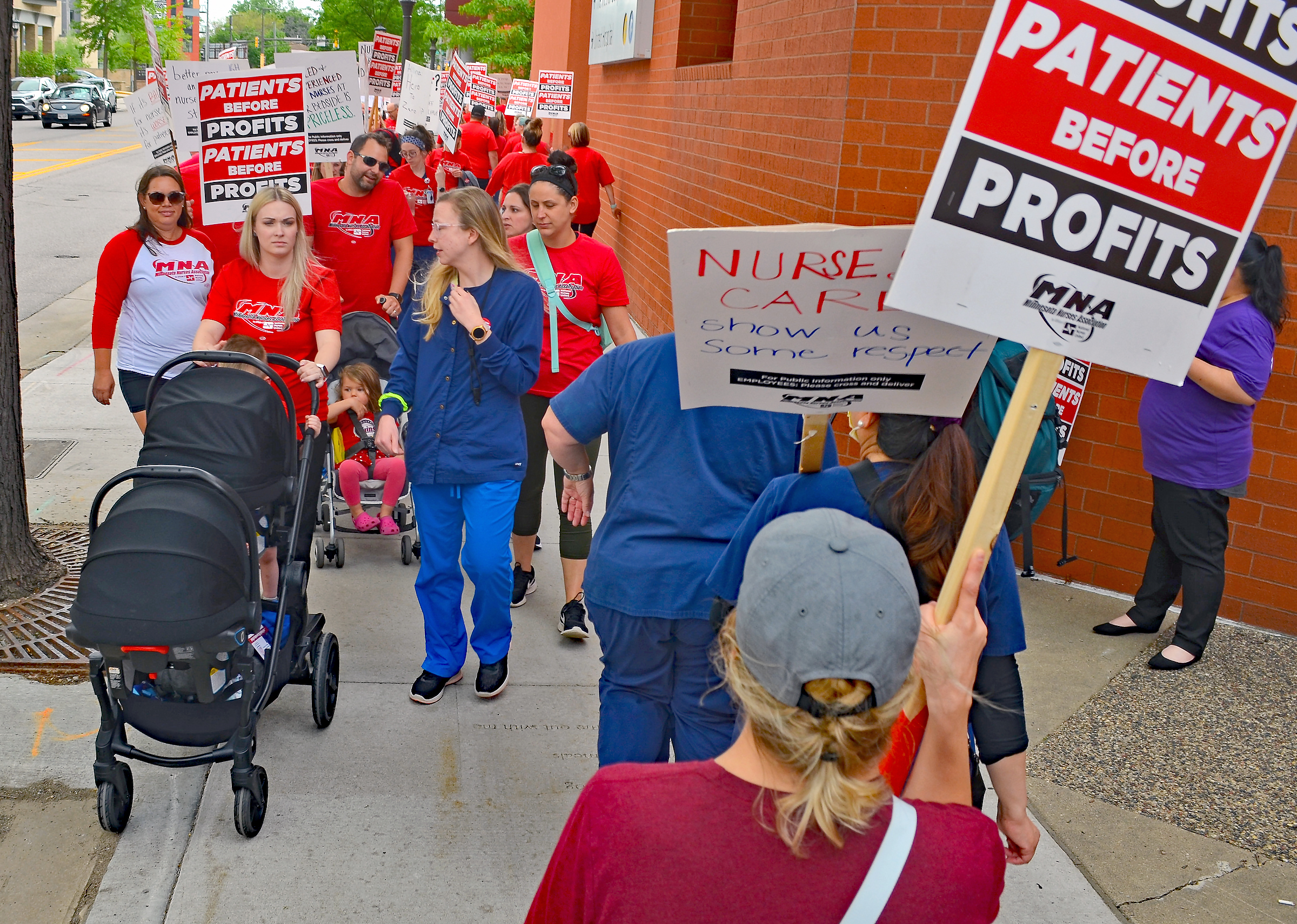 Registered nurses picketed outside 11 Twin Cities hospitals yesterday, calling on health care executives to put patients over profits in contract negotiations with their union, the Minnesota Nurses Association (MNA).