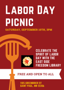 On Saturday, Sept. 10, from 3 to 6 p.m., the East Side Freedom Library will host a Labor Solidarity Picnic on our beautiful front lawn. Come learn other labor history stories that you and your families might not know. And come hear about current labor struggles, from union organizing at Starbucks, Amazon and Half Price Books to the struggles of railroad workers nurses, nurses and other health care workers, and of Building Trades workers today.
