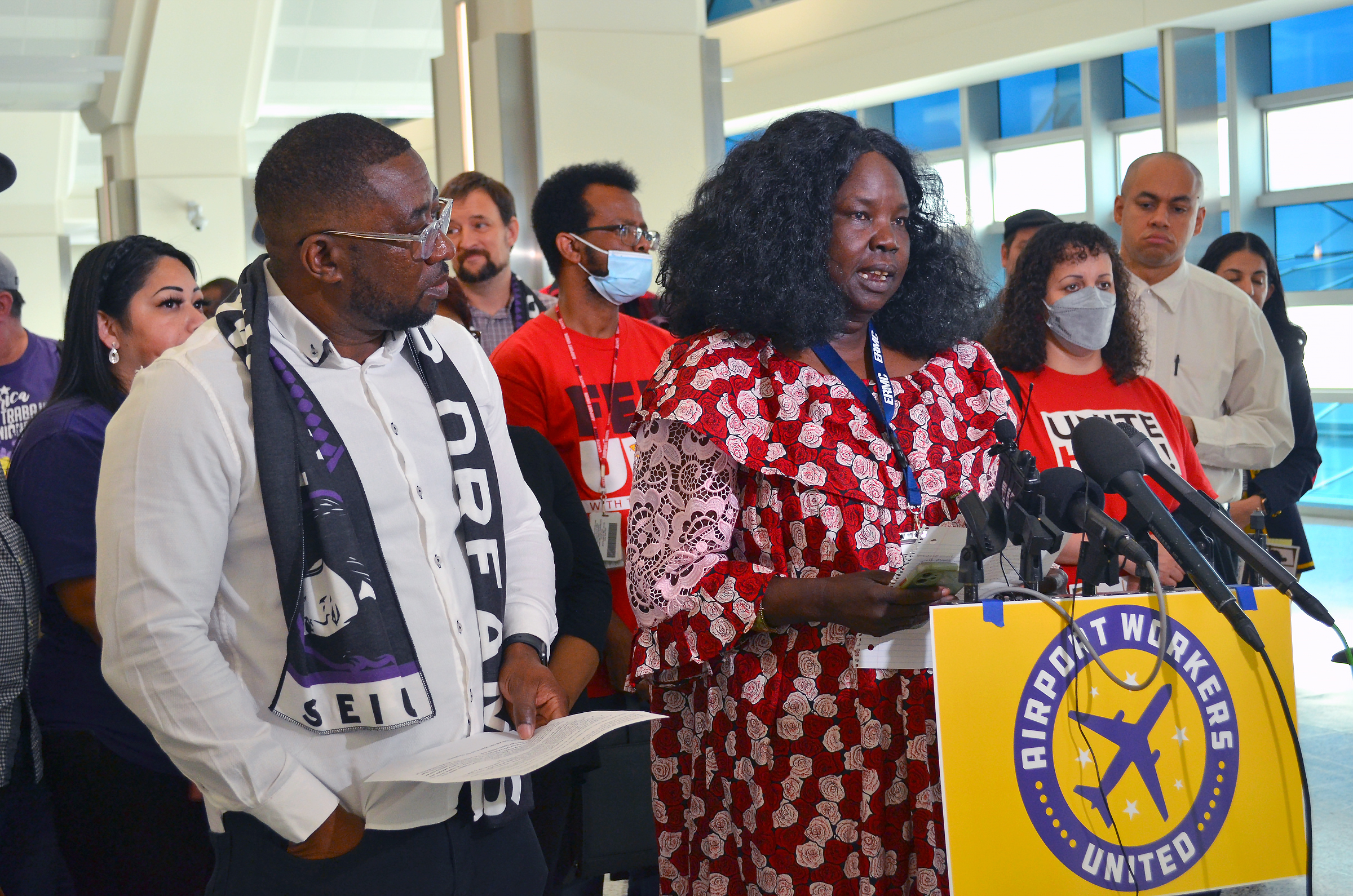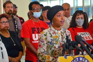 “For the last two years we’ve been saying essential workers should be celebrated as heroes,” Omar said. “They have kept our economy going, they’ve kept businesses going and they’ve kept this airport going. It’s imperative that we don’t just say thank you, but we thank them with benefits, with wages and with labor standards.”