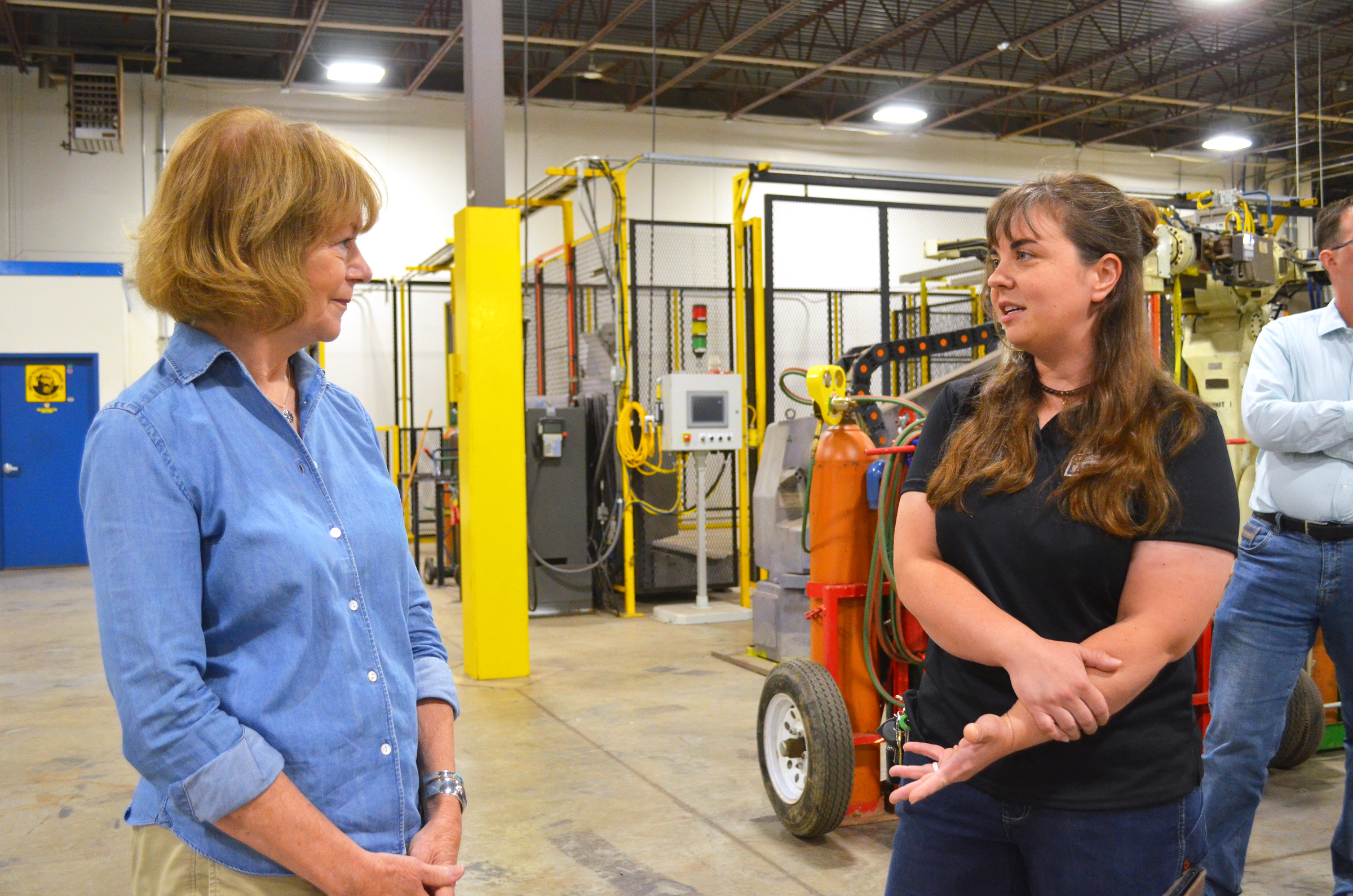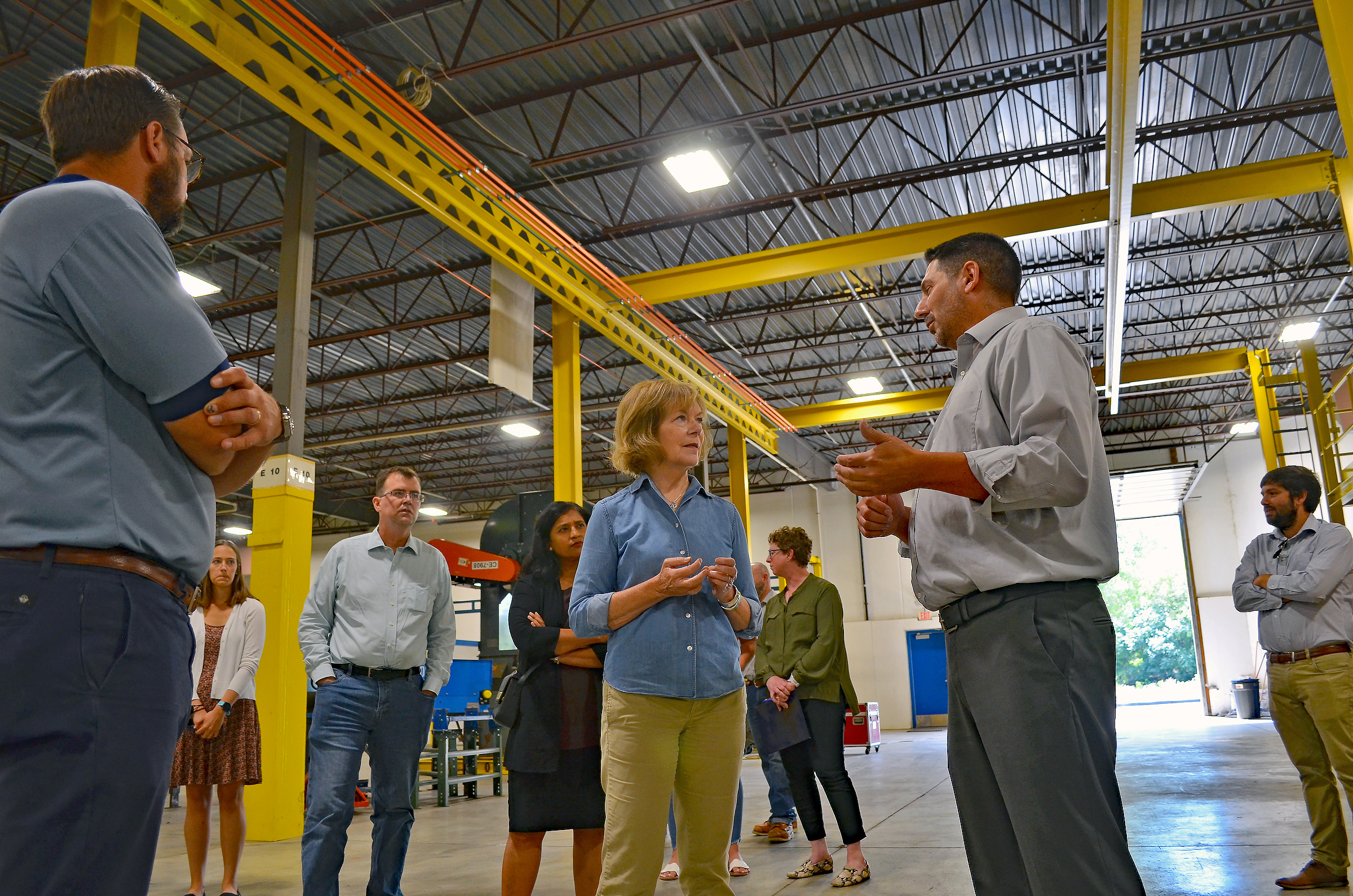 Matt Campanario, executive director of the Carpenters Training Institute, leads Sen. Tina Smith on a tour of the LJ Shosten Training Center in St. Paul, which houses the union’s pile driver and millwright apprenticeship programs.