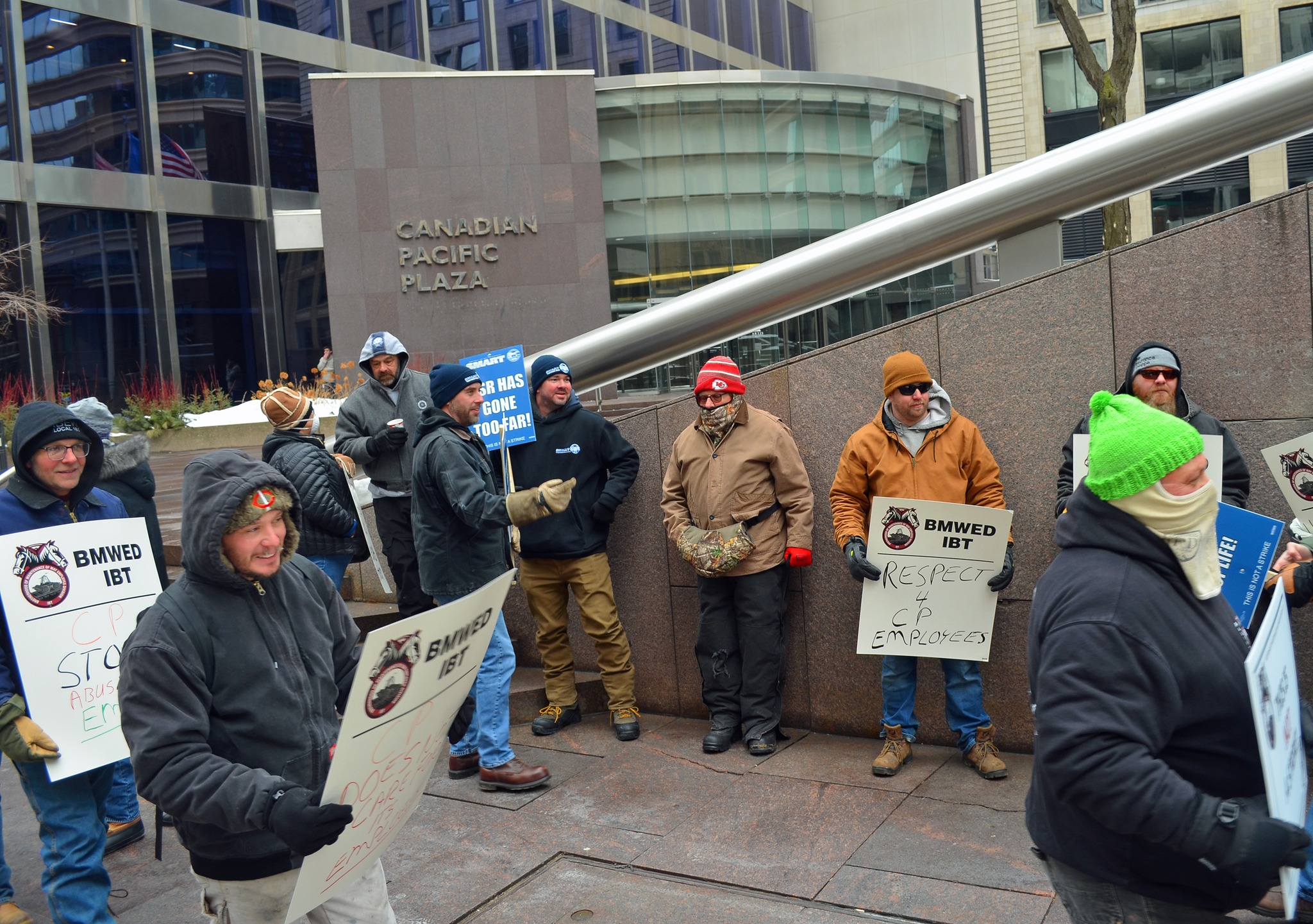 BMWED represents workers who build, maintain, repair and inspect CP Railway’s infrastructure. Other unions, including SMART-TD, Teamsters Local 120 and the Machinists union, joined the frigid rally, staged on the sidewalk that lines the Canadian Pacific Plaza skyscraper in downtown Minneapolis.