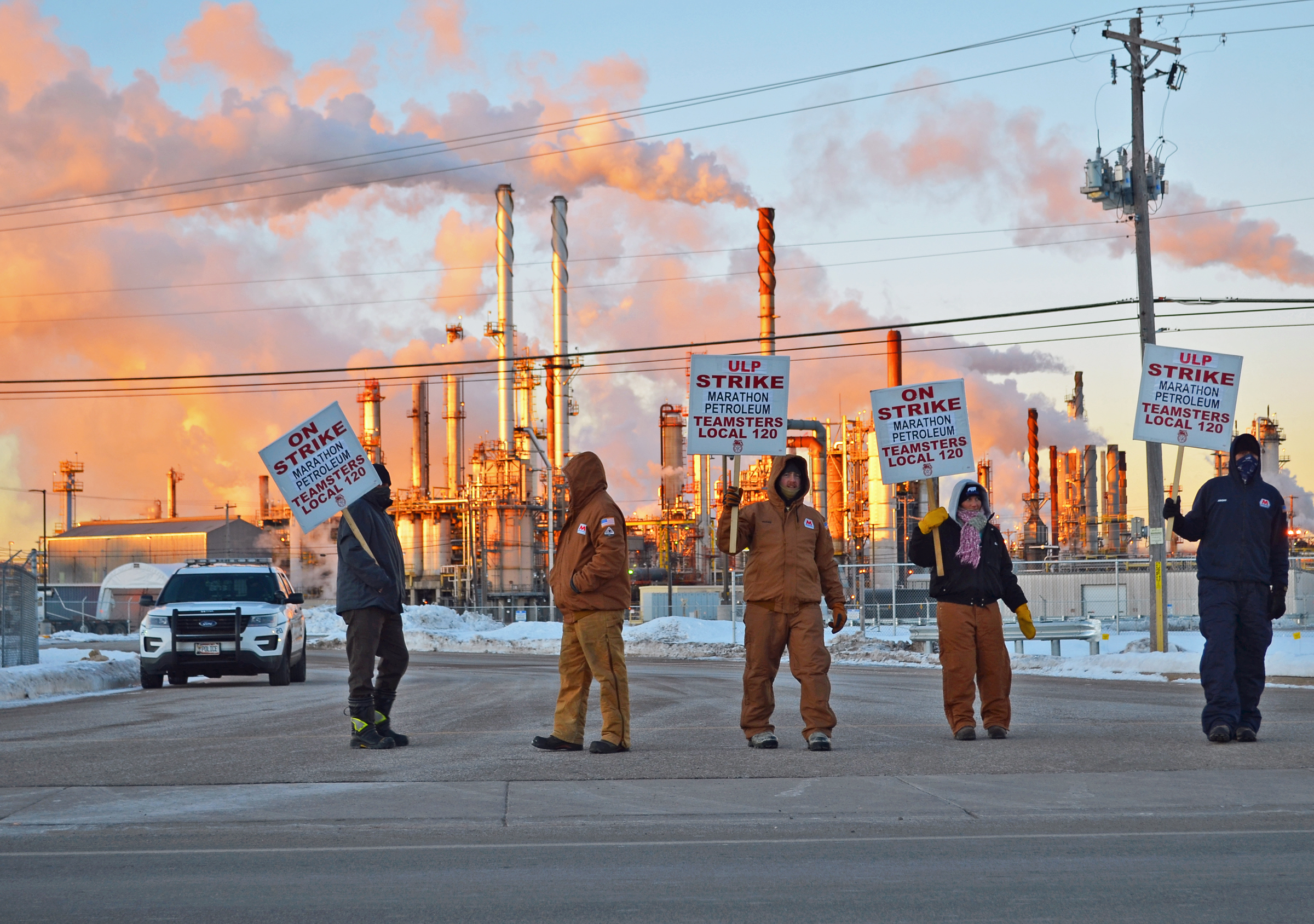 Members of Teamsters Local 120 picketed the main gate at Marathon’s St. Paul Park refinery on Day 2 of their ULP strike.