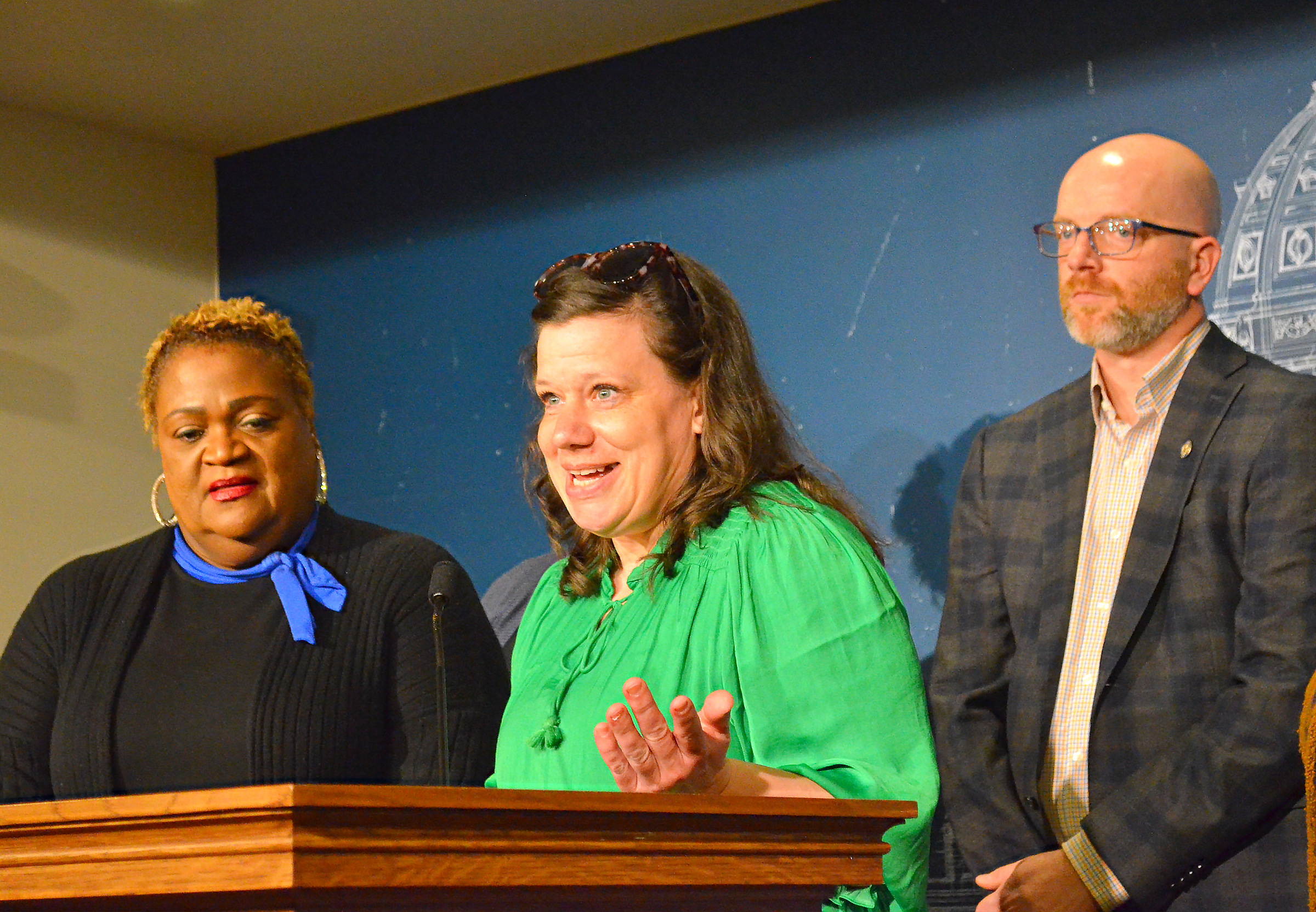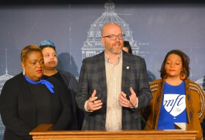 Rep. Brad Tabke holds a press conference with school employees after committee hearings on the ESP Bill of Rights.