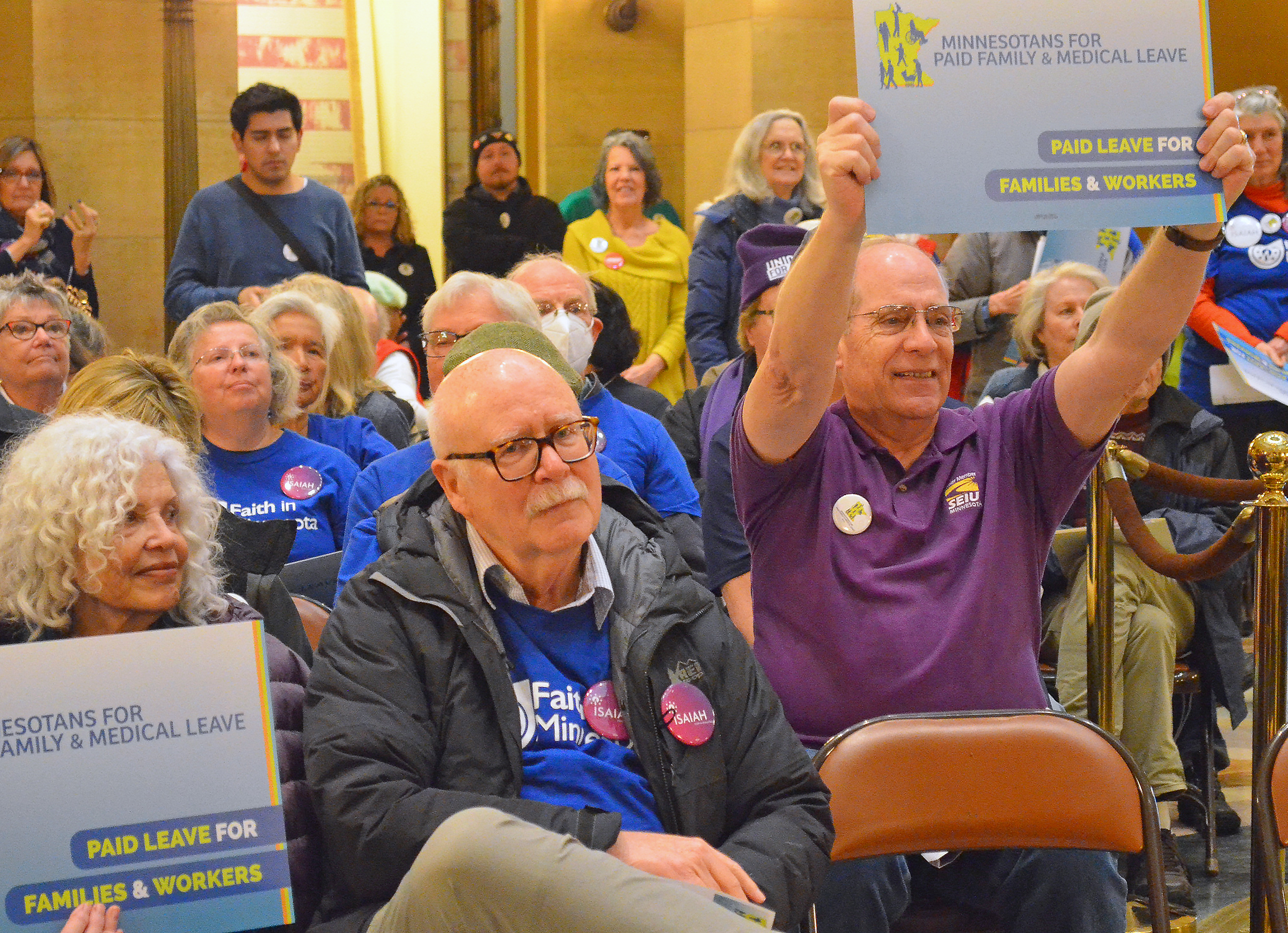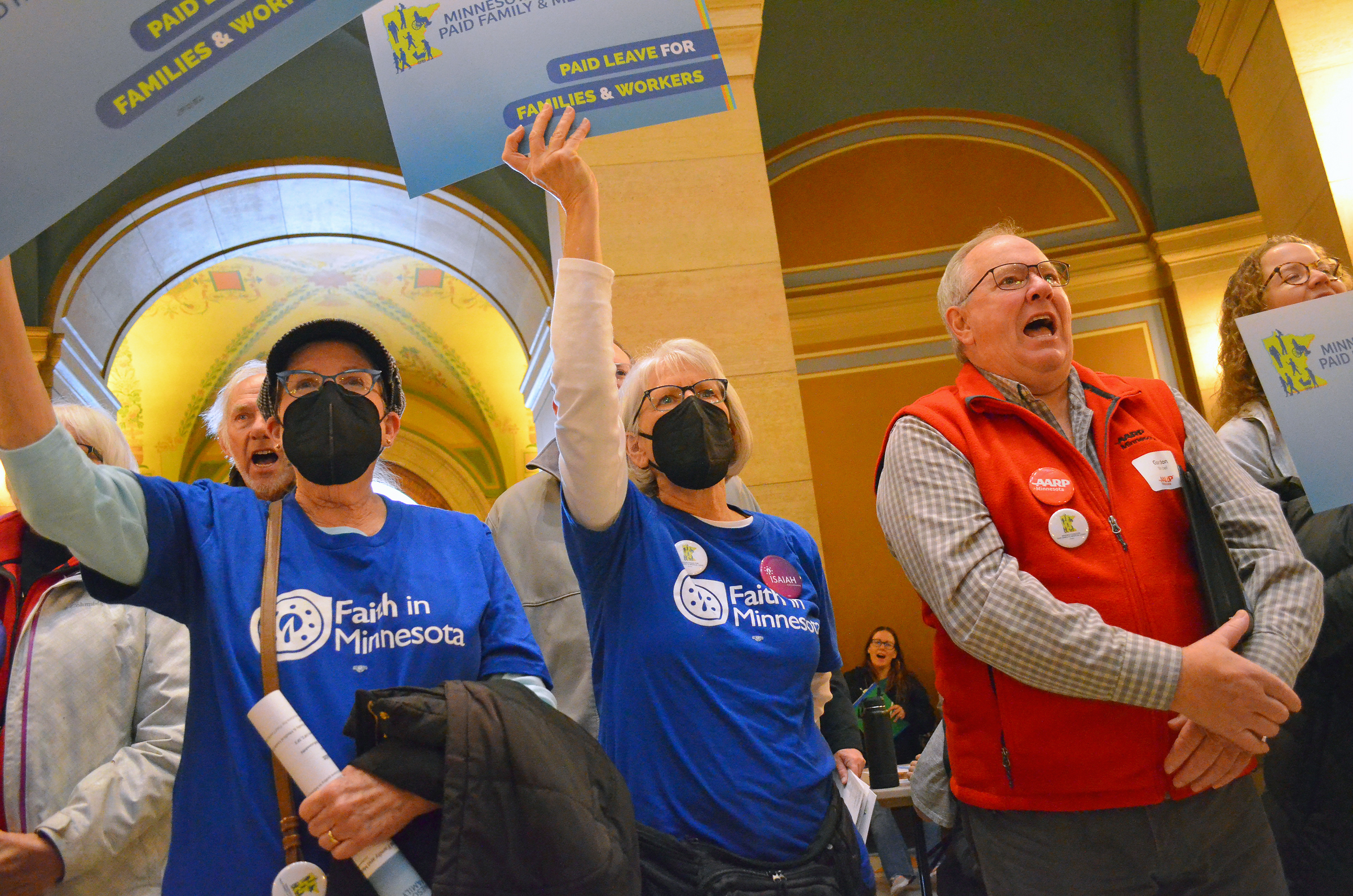 Several labor organizations, including the Minnesota AFL-CIO, are part of a broad coalition of groups that has been fighting for statewide paid leave for nearly a decade, and union colors could be spotted throughout the rotunda during the rally.