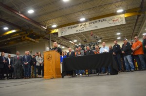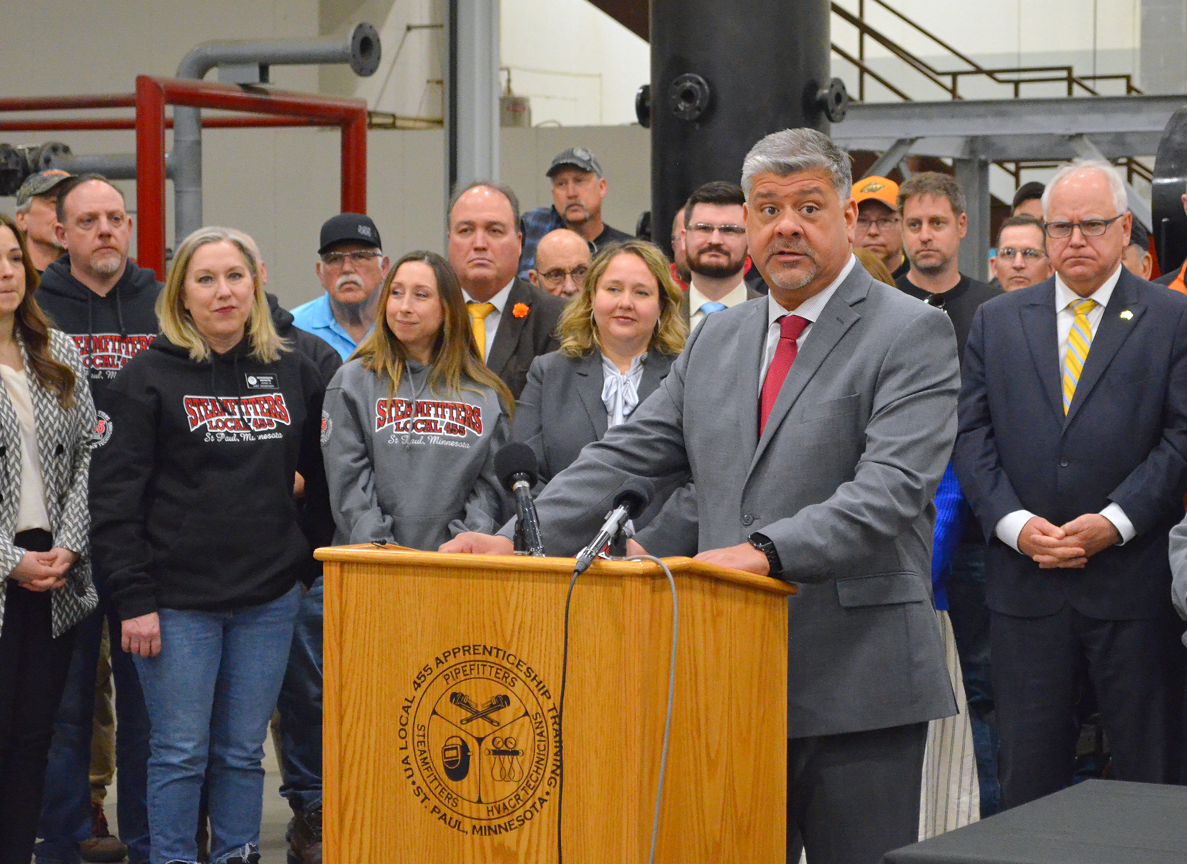 David Ybarra, president of the Minnesota Pipe Trades Association, said it was fitting to hold the bill signing at an apprenticeship training center. Building Trades unions’ apprenticeship programs, he said, “represent the gold standard in workforce development,” with “best-in-class” safety training specific to each craft.