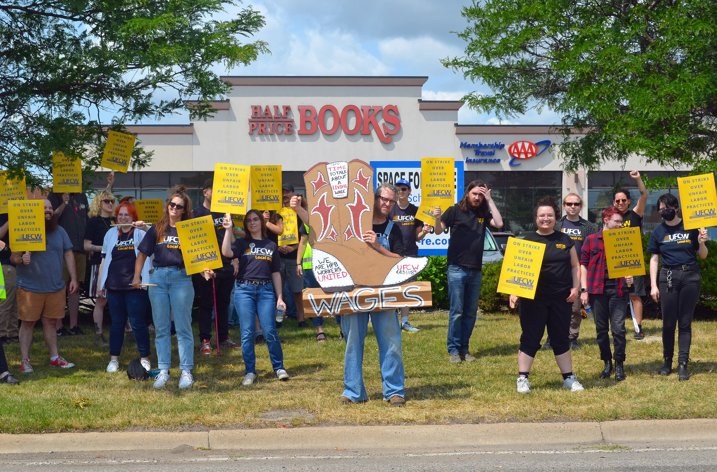 Fed up with slow negotiations and an “insulting” wage offer, Half Price Books workers in the Twin Cities called a two-day strike this morning, and more than 40 union members – about three-quarters of the bargaining unit – showed up in Brooklyn Center at the site of scheduled talks with management.