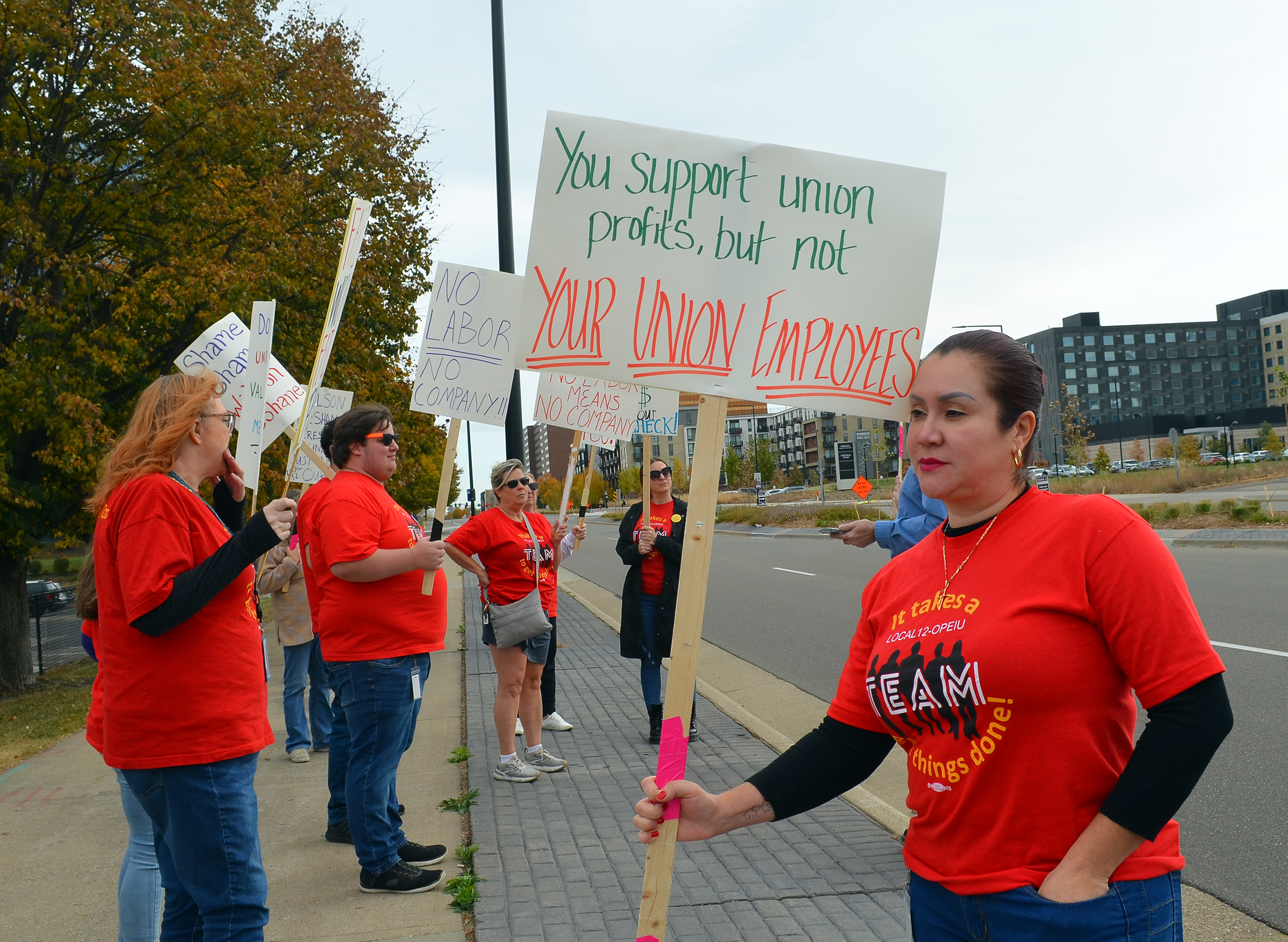 Members of Office and Professional Employees (OPEIU) Local 12 set up informational picket lines outside Wilson-McShane’s offices in Bloomington and Kansas City on Oct. 24. Organizers said it was almost certainly the first time that workers at the company, which works closely with organized labor, had resorted to picketing.