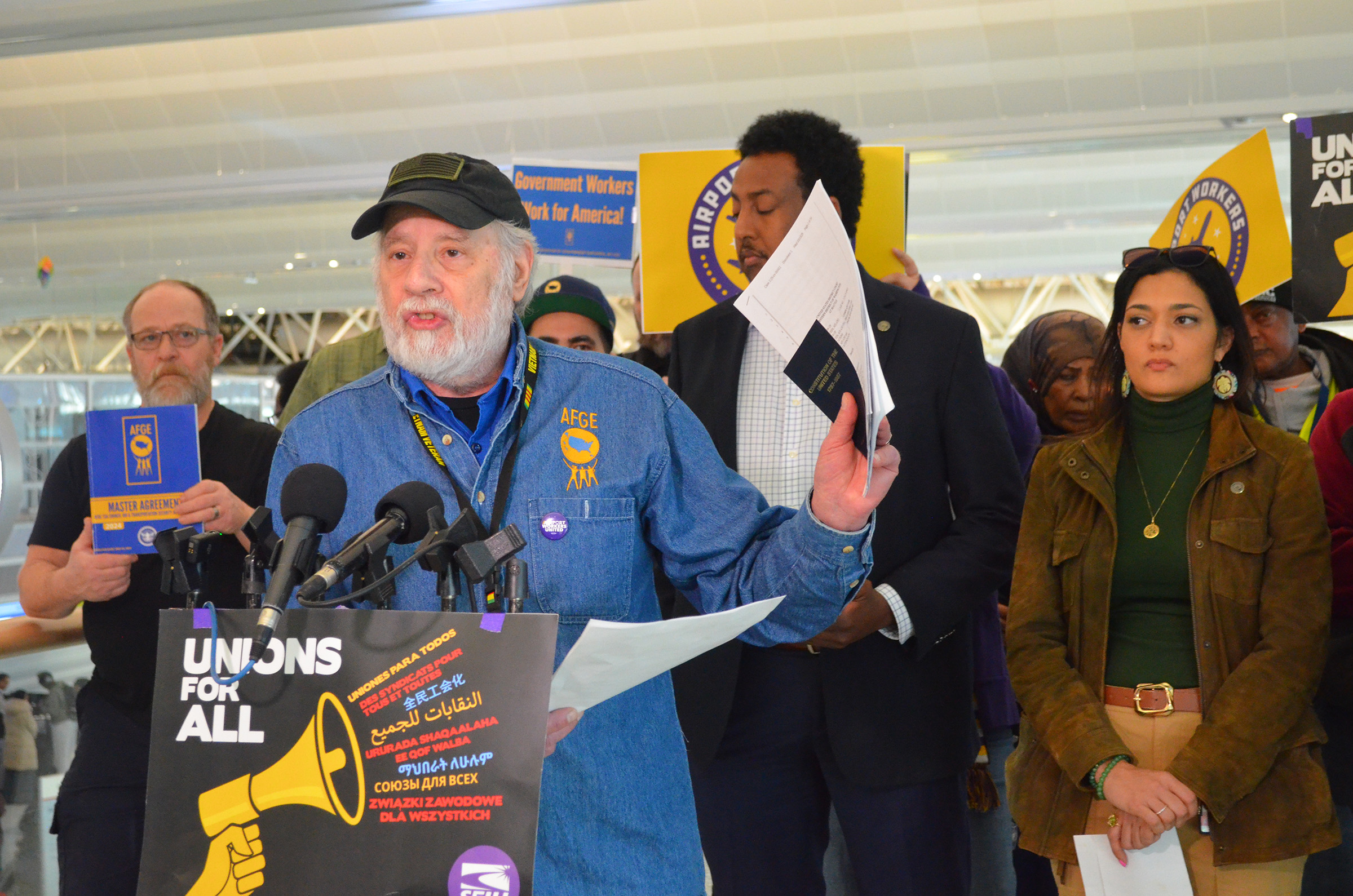 Members of AFGE Local 899 who work as transportation security officers at MSP International Airport held copies of their union contract – terminated by the Trump administration last month – during a press conference.
