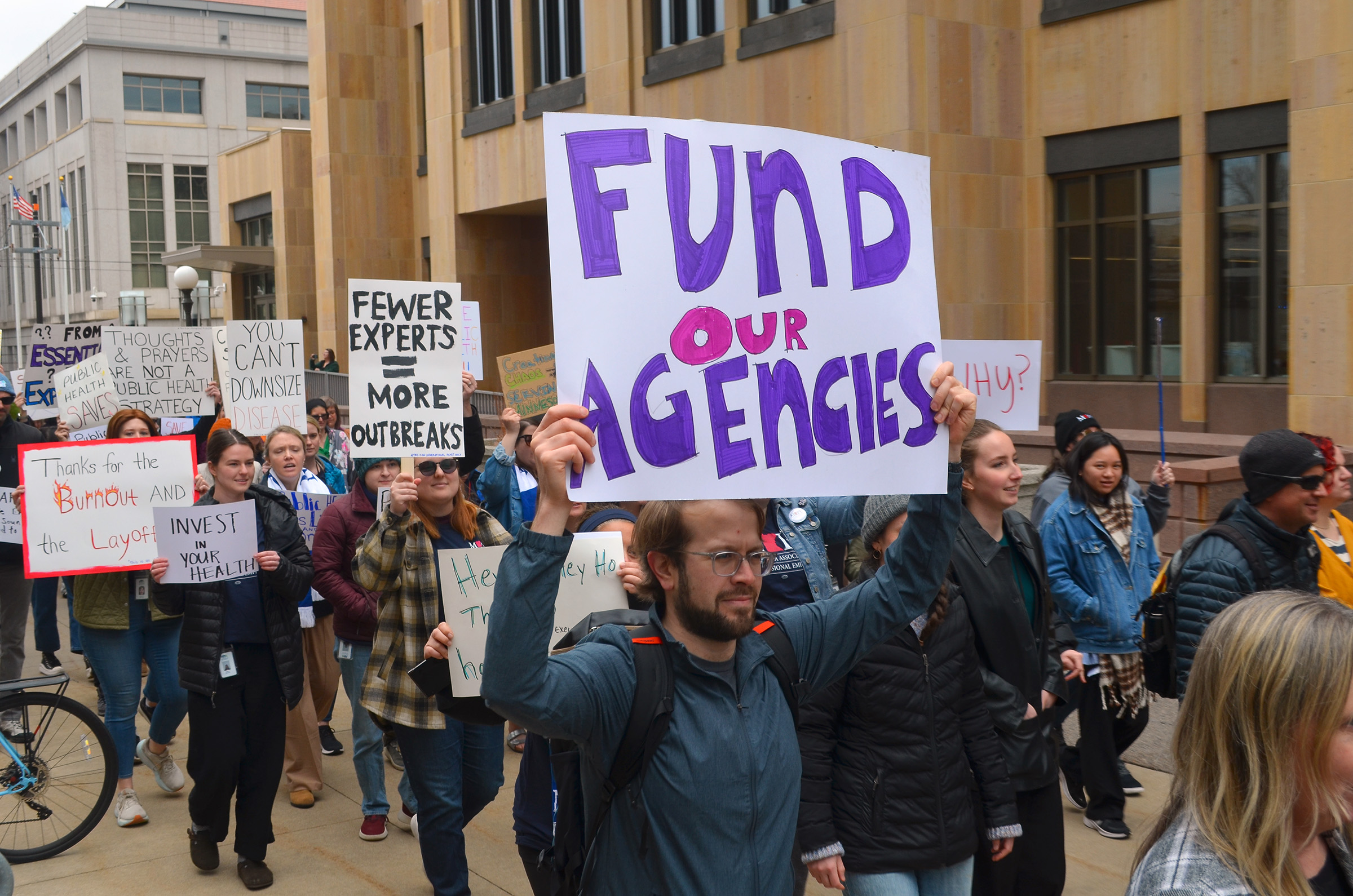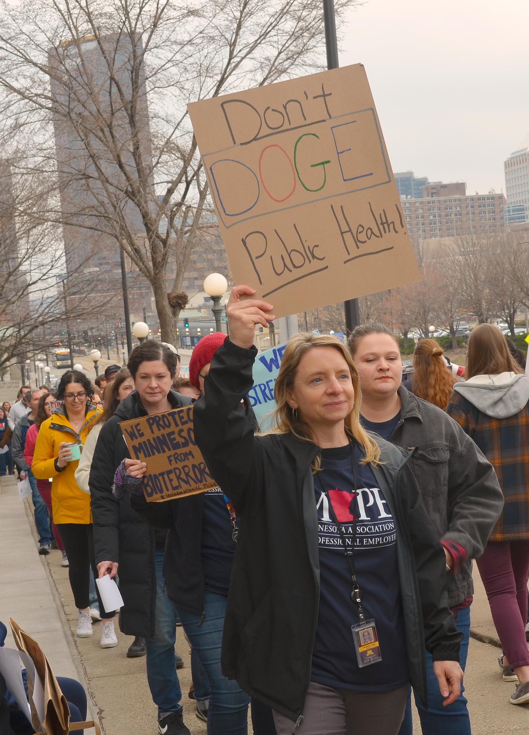 Members of the Minnesota Association of Professional Employees (MAPE) held informational picketing in support of about 170 employees at the Department of Health who have been laid off as a result of federal funding cuts.