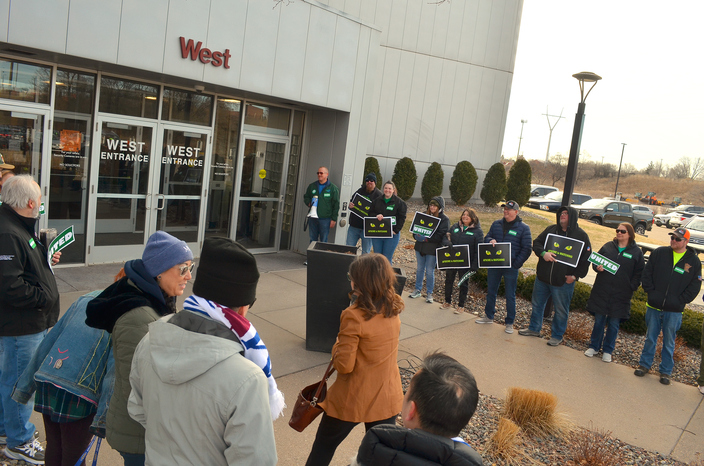 Members of AFSCME Council 5 lined the sidewalk outside the St. Paul office where their bargaining team held its first negotiations session with the State of Minnesota.