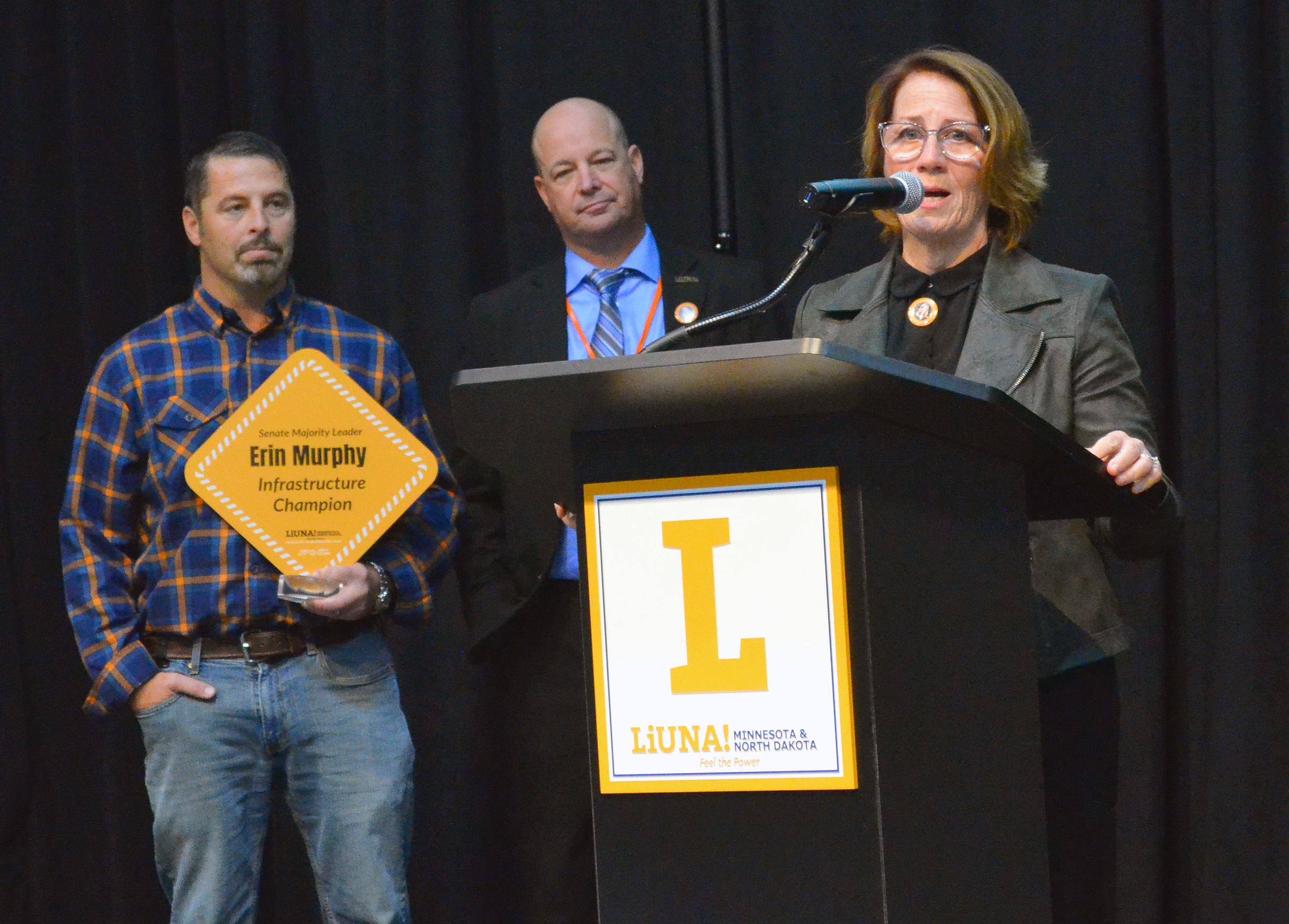 State Sen. Erin Murphy accepts an Infrastructure Champion award from LIUNA Local 563 Business Manager Joe Fowler (L) and LIUNA Minnesota and North Dakota President Joel Smith.