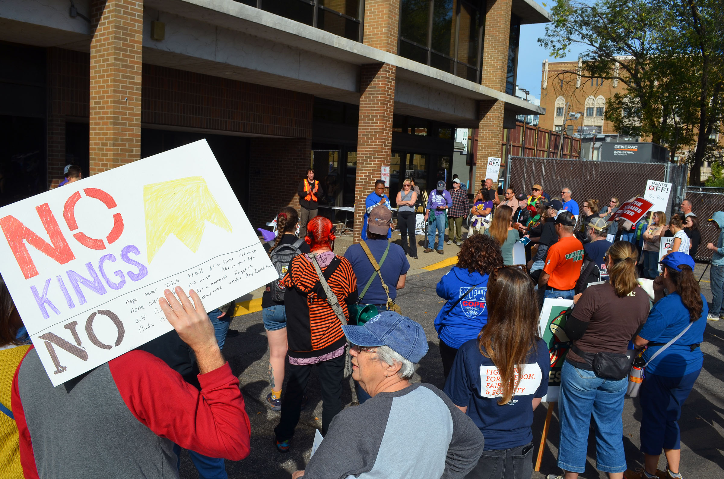 Union members gather outside the United Labor Centre in Minneapolis before walking together to “No Kings.”