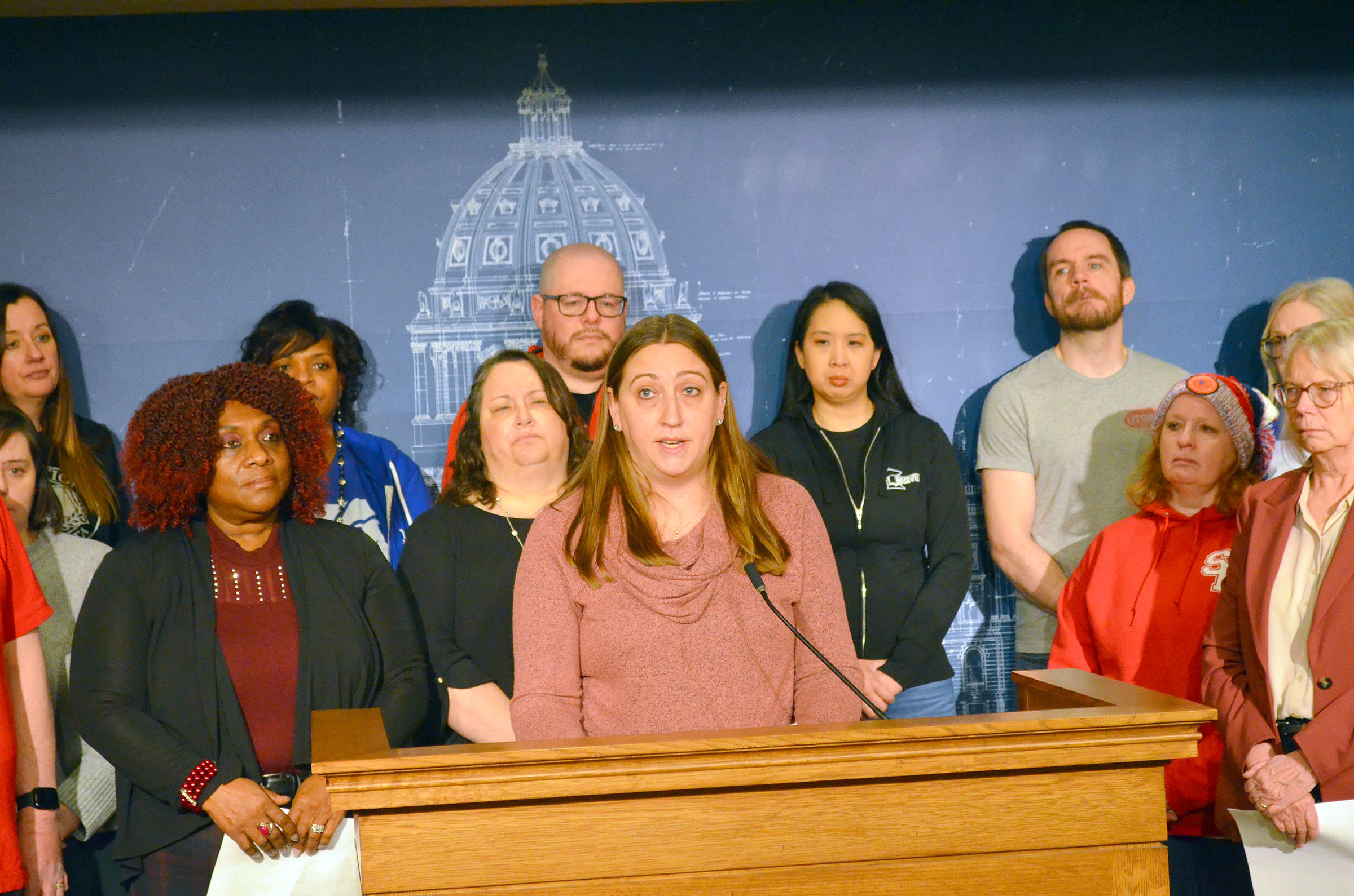 Rep. Liz Reyer of Eagan joins members of Education Minnesota at a Capitol press conference about the Educator Group Insurance Program.