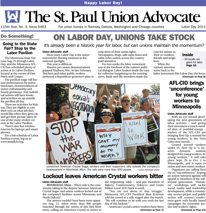 The Union Advocate is the official publication of the Saint Paul Regional Labor Federation, AFL-CIO. With more than 100 affiliate unions, the Regional Labor Federation unites more about 50,000 union members who live or work in Ramsey, Washington, Dakota and Chisago counties. The Regional Labor Federation supports local political, organizing and issue-oriented campaigns by mobilizing its network of committed union volunteers, and The Union Advocate newspaper is an important outreach component of those campaigns.