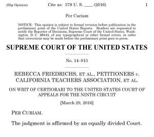 The U.S. Supreme Court yesterday rejected an attempt by corporate interests to weaken public-sector workers’ unions and, in the process, undermine the public services they provide. The court’s decision in Friedrichs v. CTA is a victory for “teachers, nurses, firefighters and public-service workers nationwide,” said Eliot Seide, director of AFSCME Council 5, which represents 43,000 […]