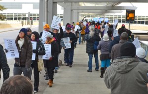 A demonstration in support of low-wage workers who assist Delta Air Lines’ operations at Minneapolis-St. Paul International Airport began at today’s meeting of the Metropolitan Airports Commission (MAC) and spilled into the roadway outside Terminal 1’s ticketing area, forcing lane closures and resulting in 13 arrests. The protest targeted low wages, under-staffing and other poor […]